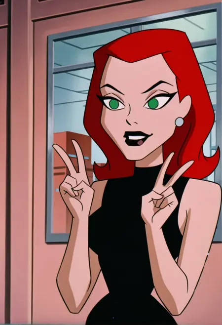Trigger = zzbfrgzz, Tags = 1girl, solo, green eyes, black dress, red hair, sleeveless dress, black lips, breasts, earrings