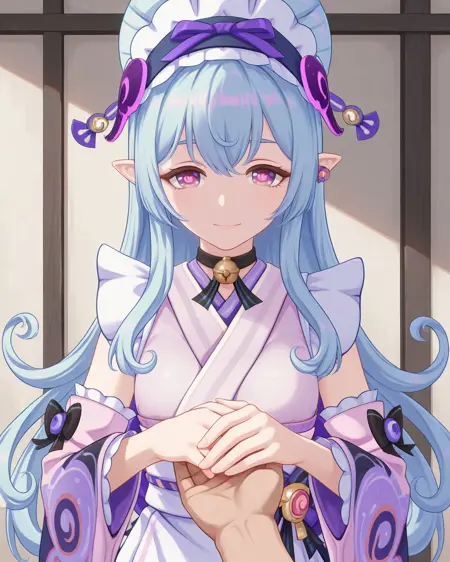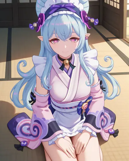 ベースプロンプト: mizuki, 1girl, long hair, blue hair, bangs, hair ornament, maid headdress, pointy ears, purple eyes,