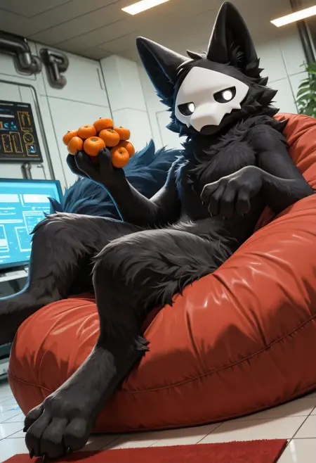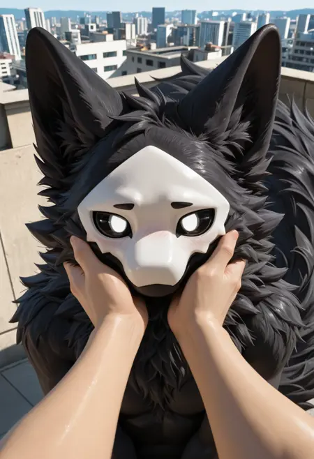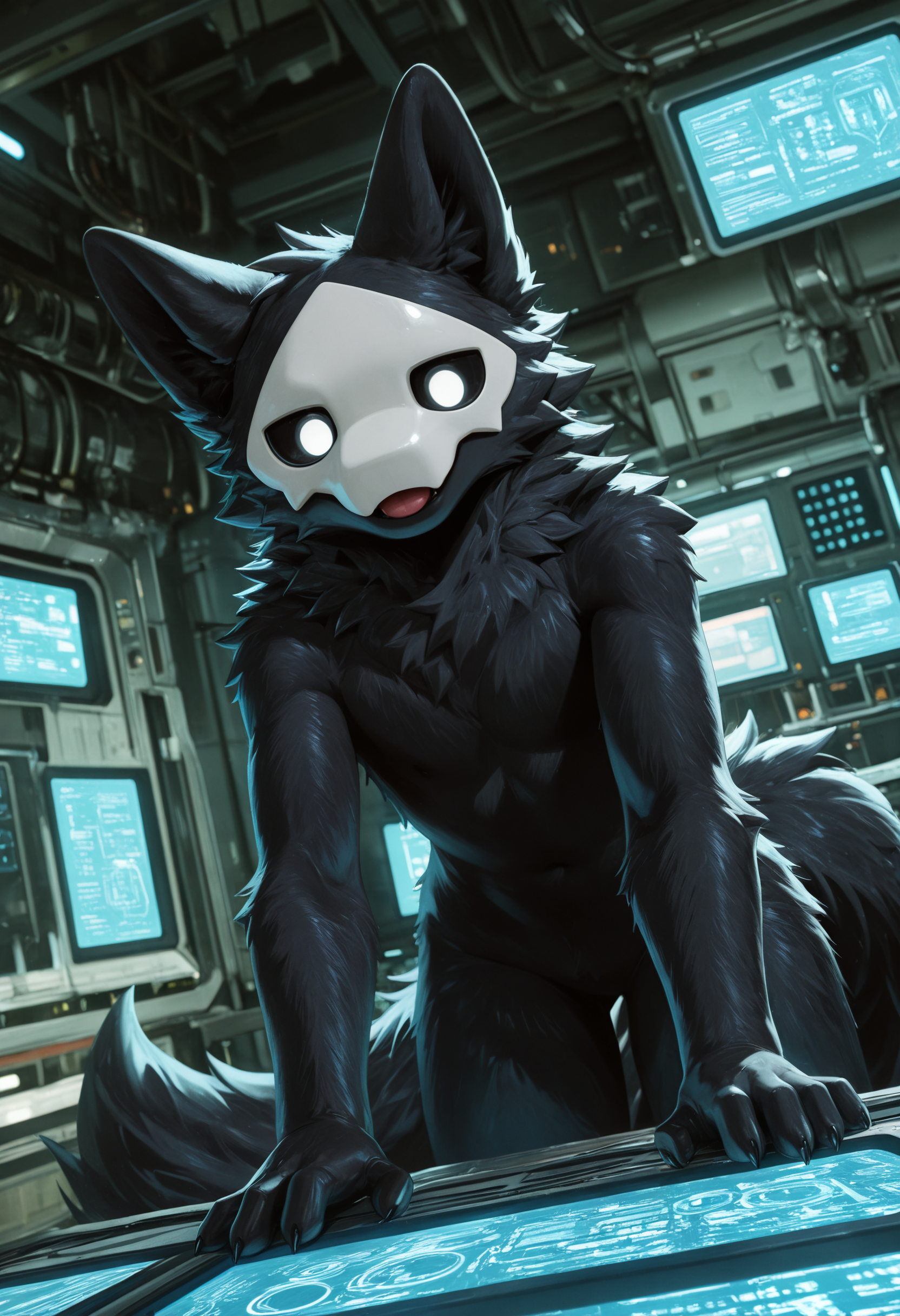 puro_changed, adult, male, black fur, mask, black body, anthro, furry, solo, fur, white eyes, black sclera, colored sclera, no humans, black eyes, fluffy tail, animal ears