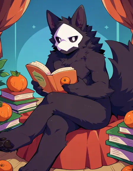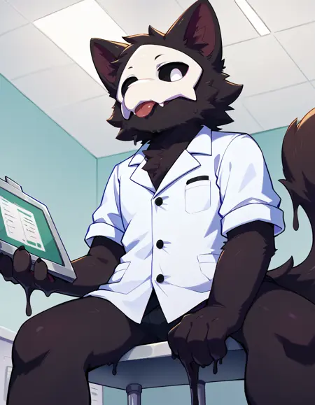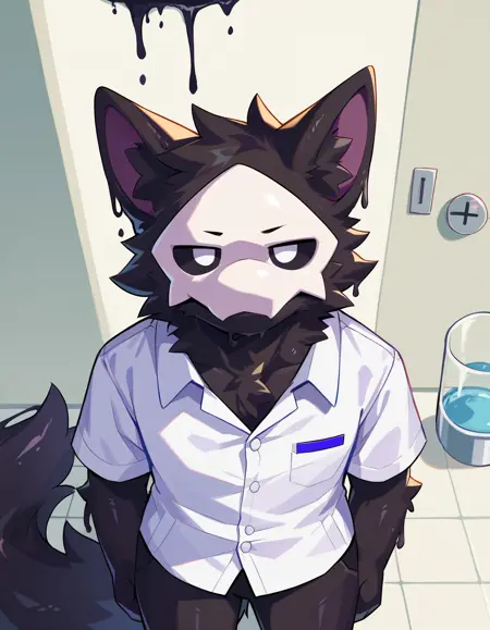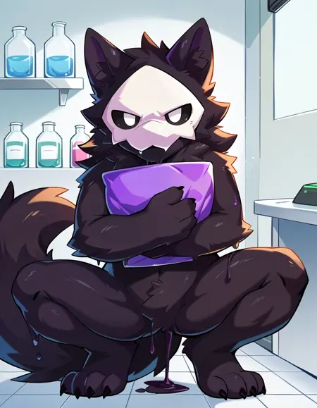 puro_changed, adult, male, black fur, mask, black body, anthro, furry, solo, fur, white eyes, black sclera, colored sclera, no humans, black eyes, fluffy tail, animal ears