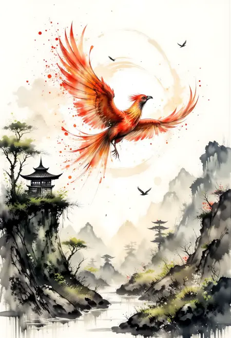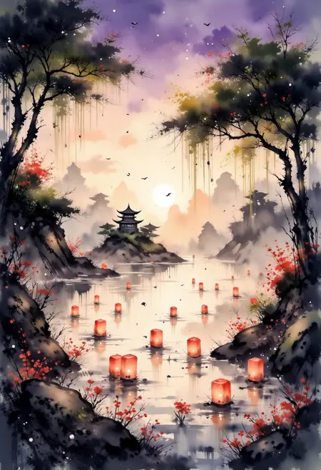 凭借其半写实设计、墨笔细节与梦幻水彩渐变的无缝融合,此LoRA是实现艺术愿景不可或缺的资源。今天就踏入宁静风景、神话生物与丰富叙事的世界,体验日本水墨与水彩融合LoRA吧!
