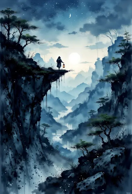 氛围场景:生成宁静自然场景或戏剧性叙事时刻,实现水墨与水彩的平衡构图。