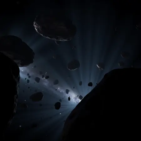 無数の流星が深宇宙の背景に鮮やかな軌跡を残しながら通り過ぎ、この地域を覆う神秘的な空気をさらに高める。この宇宙の陰影の奥で稀で貴重な太陽光が、塵や破片を貫き、ティンダル効果の圧倒的な光景を生み出す。光はあらゆる方向に散乱し、輝かしいハローを放って、小惑星帯を宇宙の美しさに満ちた楽園へと変える。
