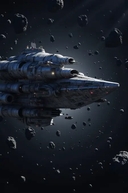 小惑星または月のような、クレーターで覆われた天体のアップビュー。小惑星帯の中心で、壮麗な宇宙船が宇宙の破片の中を切り裂いて進む。その船体は金属的な光沢を放ち、人類が星々への大胆な探求を象徴している。ぎざぎざした小惑星の間を縫うように進む中、何十億年もの宇宙衝突によって鏡のように磨かれた表面を避け、船は一瞬の不運をかろうじて回避する。その一つ一つの機動は、乗組員の熟練と勇気の証である。