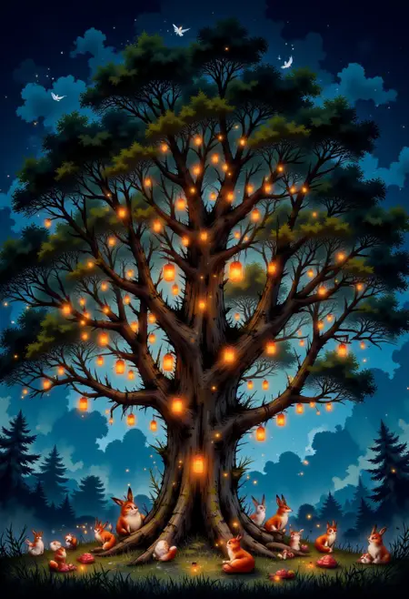 - 动态光影: LoRA擅长生成柔和而魔幻的光影效果,从发光的灯笼到穿透树冠的阳光束。