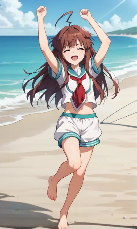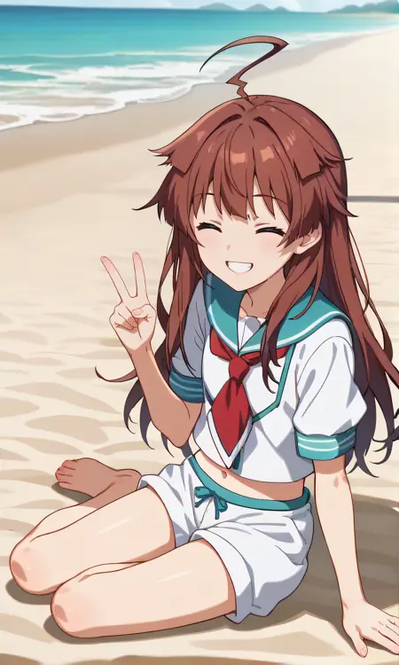 kuma, long brown hair, red eyes, serafuku, navel, short sleeves, white shorts