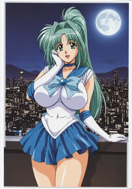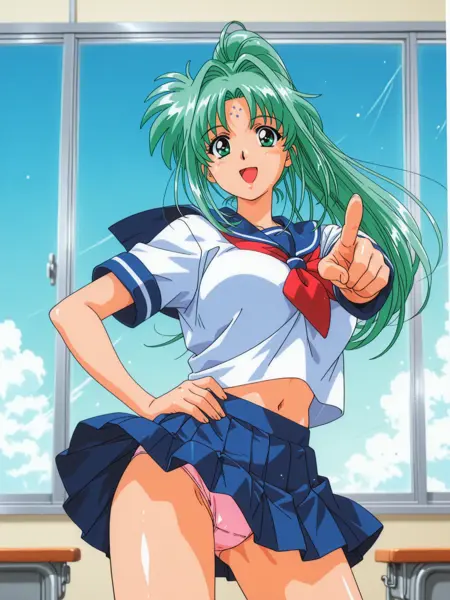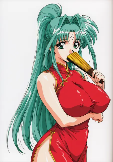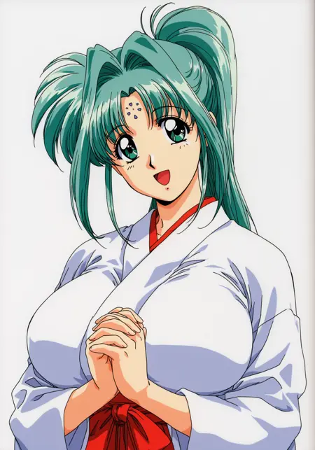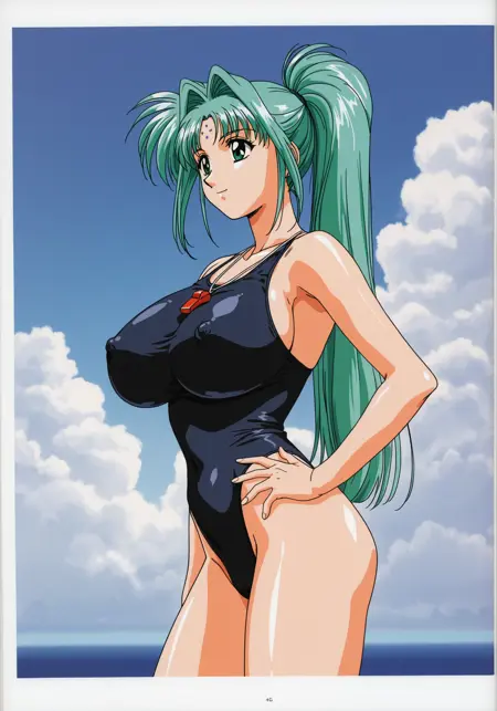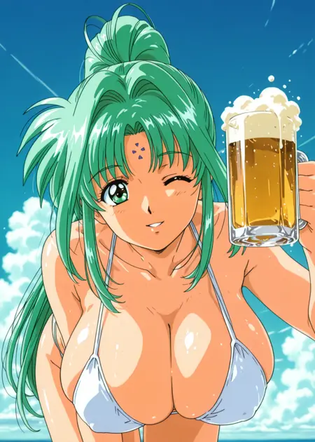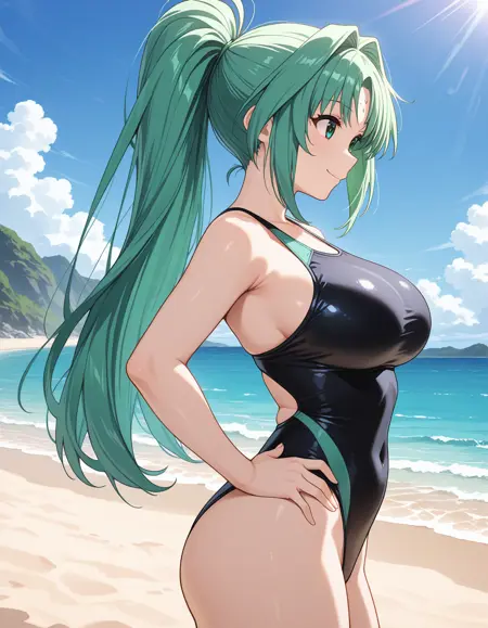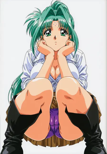 lindy harlaown, green hair, long hair, high ponytail, hair intakes, forehead mark, green eyes