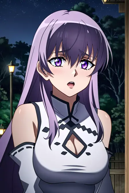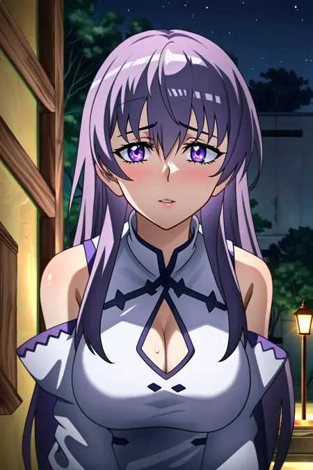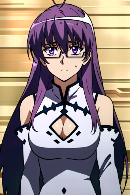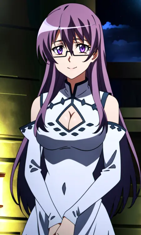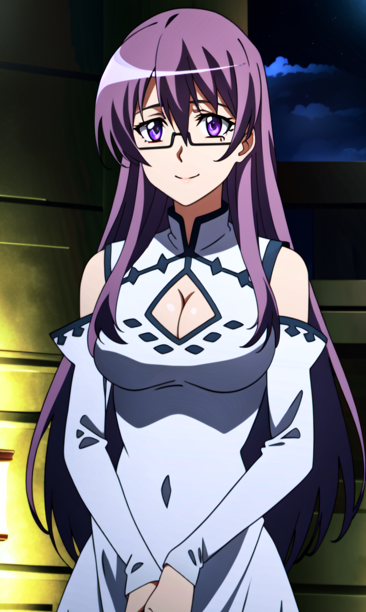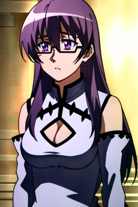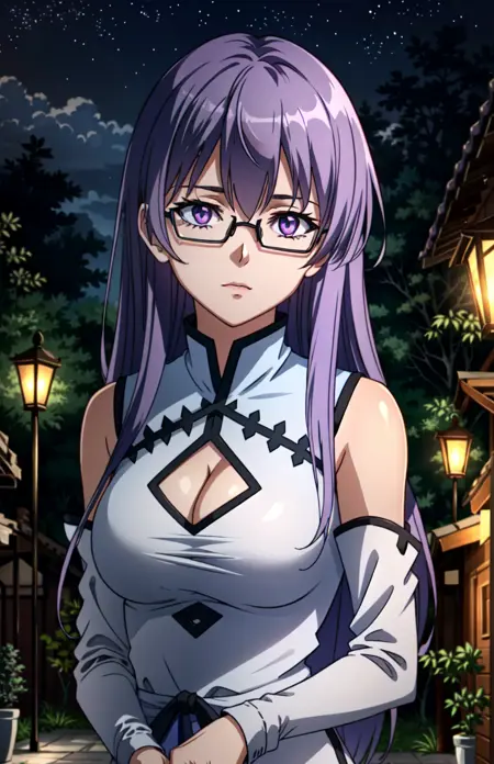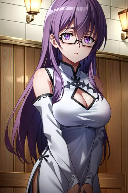 Sheele, 1girl, solo, 紫髪, めがね, 乳房, 長髪, 胸元, 紫目, 胸元カットアウト, 衣服カットアウト, 中国風服, 外れ袖, 大きな乳房, 中国風ドレス, ドレス, 中くらいの乳房