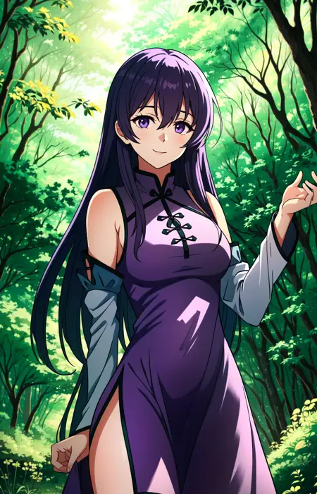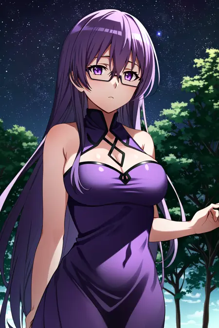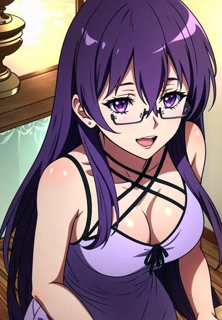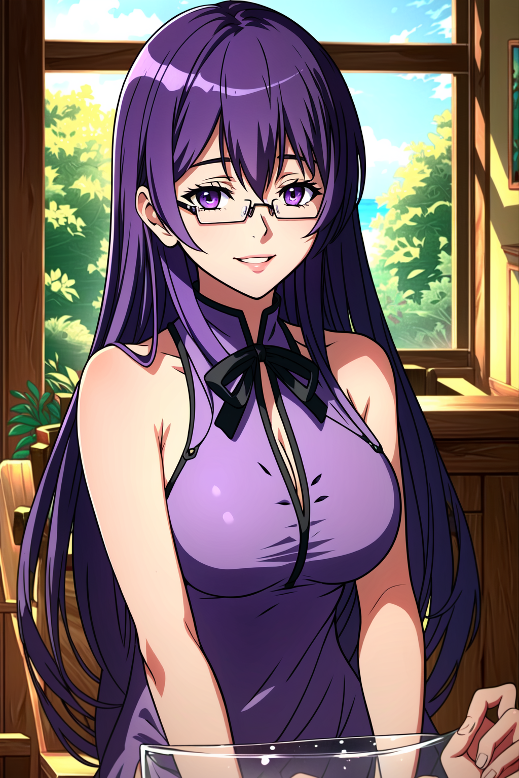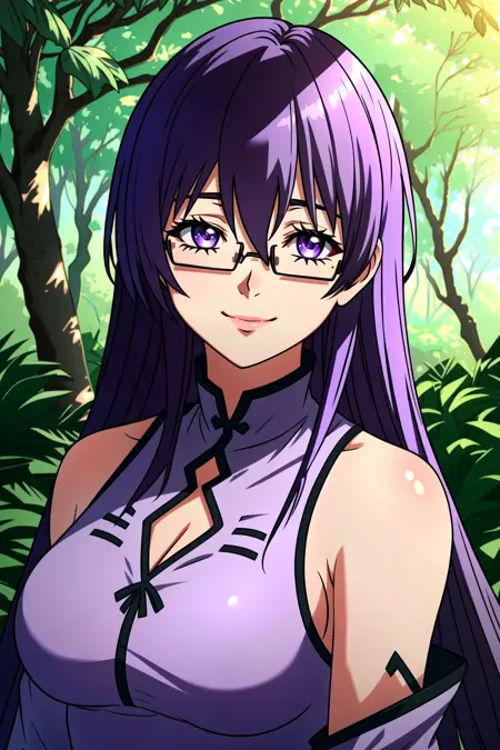 Sheele, 1girl, solo, 보라색 머리카락, 안경, 가슴, 긴 머리, 젖가슴, 보라색 눈, 젖가슴 컷아웃, 의상 컷아웃, 중국 복장, 분리된 소매, 큰 가슴, 중국 드레스, 드레스, 중간 크기 가슴