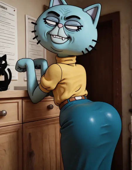 elderly,female cat,light yellow top,blue skirt,blue fur skin,tail