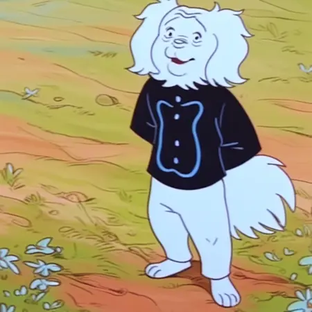 Dog, shih-tzu, white fur, fluffy ears, fluffy tail, black eyes,