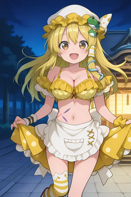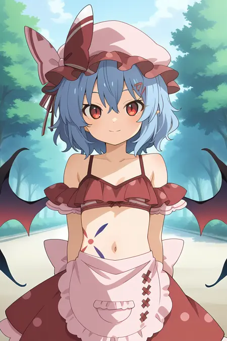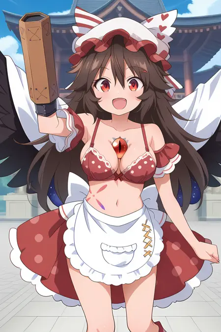 internet survivor, alternate costume, polka dot, waist apron, midriff, striped socks, red skirt, mob cap, hat, bra, puffy bra, stripped bra, tattoo,