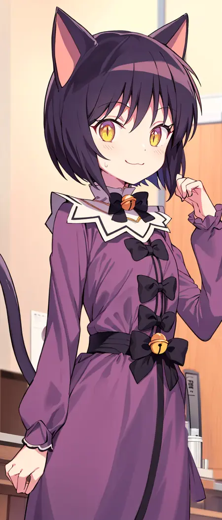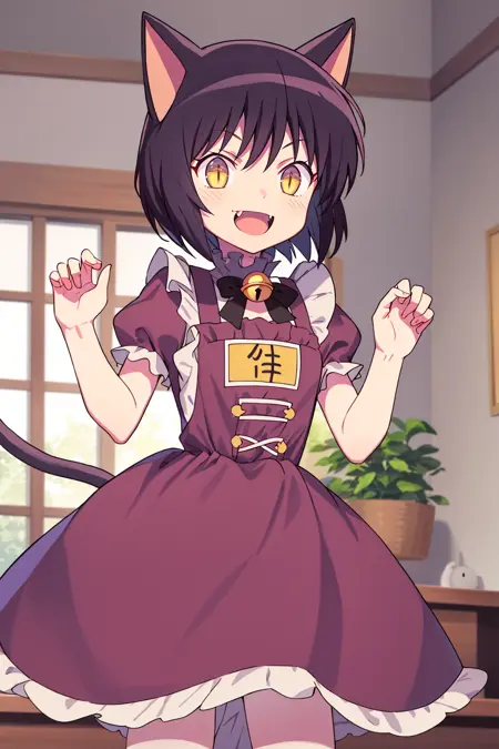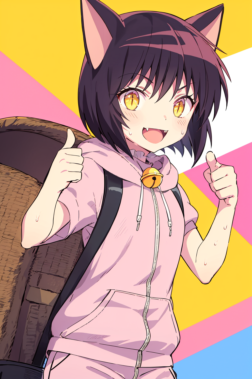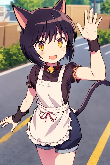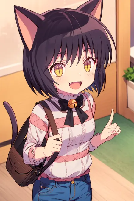 ex: 1girl,solo,fang,open mouth,looking at viewer,animal ears,cat ears,black hair,short hair,cat girl,bell,tail,cat tail,yellow eyes,slit pupils,neck bell,smile,