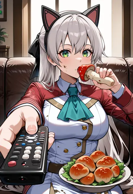 座っている、ボトルを持っている、リモコンを持っている、コントローラーを持っている、ソファに座っている、飲んでいる、視聴者を見ている、食べ物