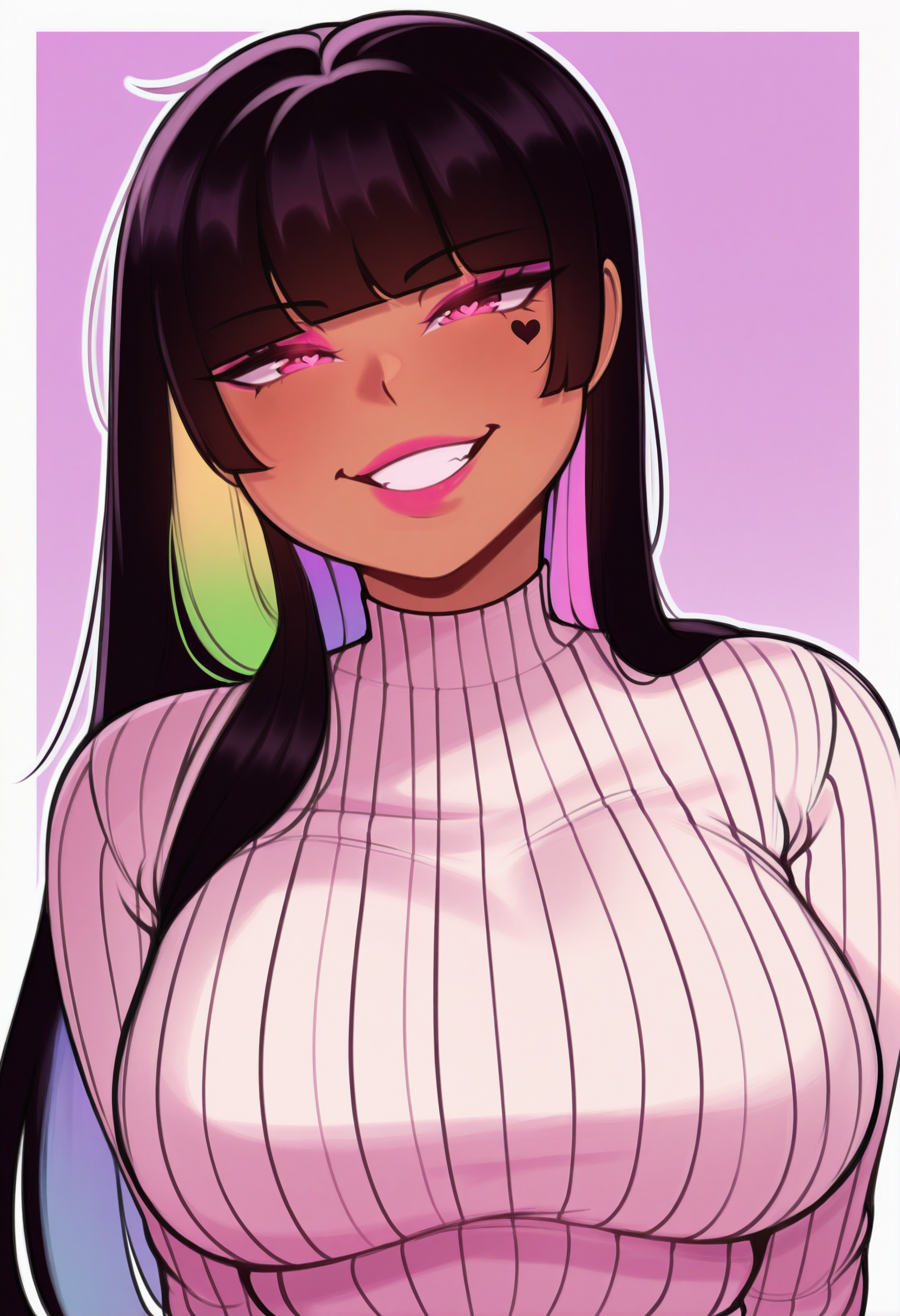 Character Tags: black hair, heart tattoo, dark-skinned female, multicolored hair, blunt bangs, long hair, makeup