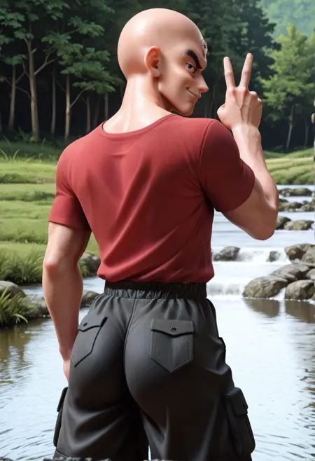 상반신 노출 남성, 녹색 바지, 녹색 팔찌, 빨간 띠