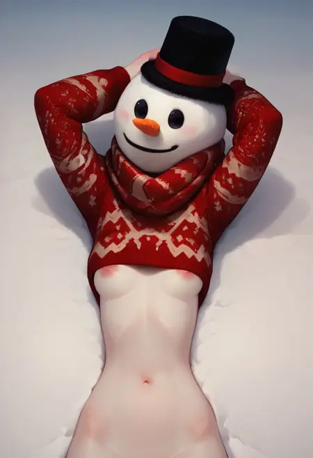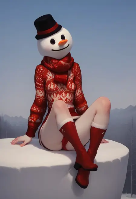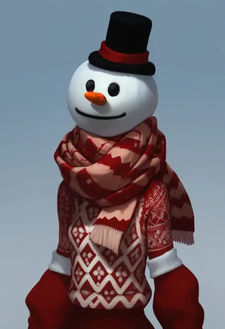 自分自身のキャラクターであるキアラ・ガムロイのLoRAモデル - 黒い円筒形の体、大きな赤いマフラー、クリスマスセーターを着た雪だるまの少女