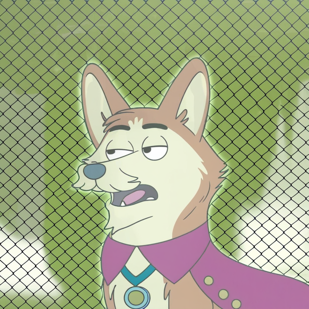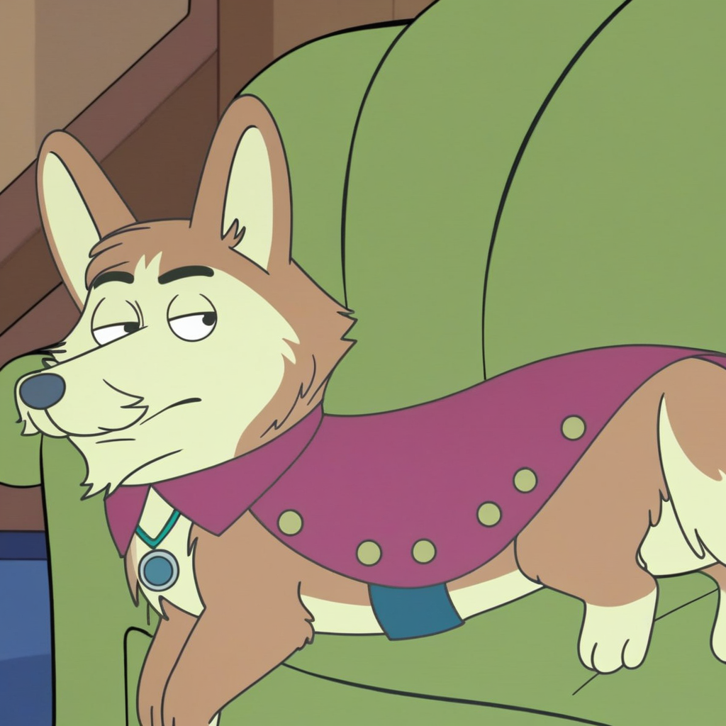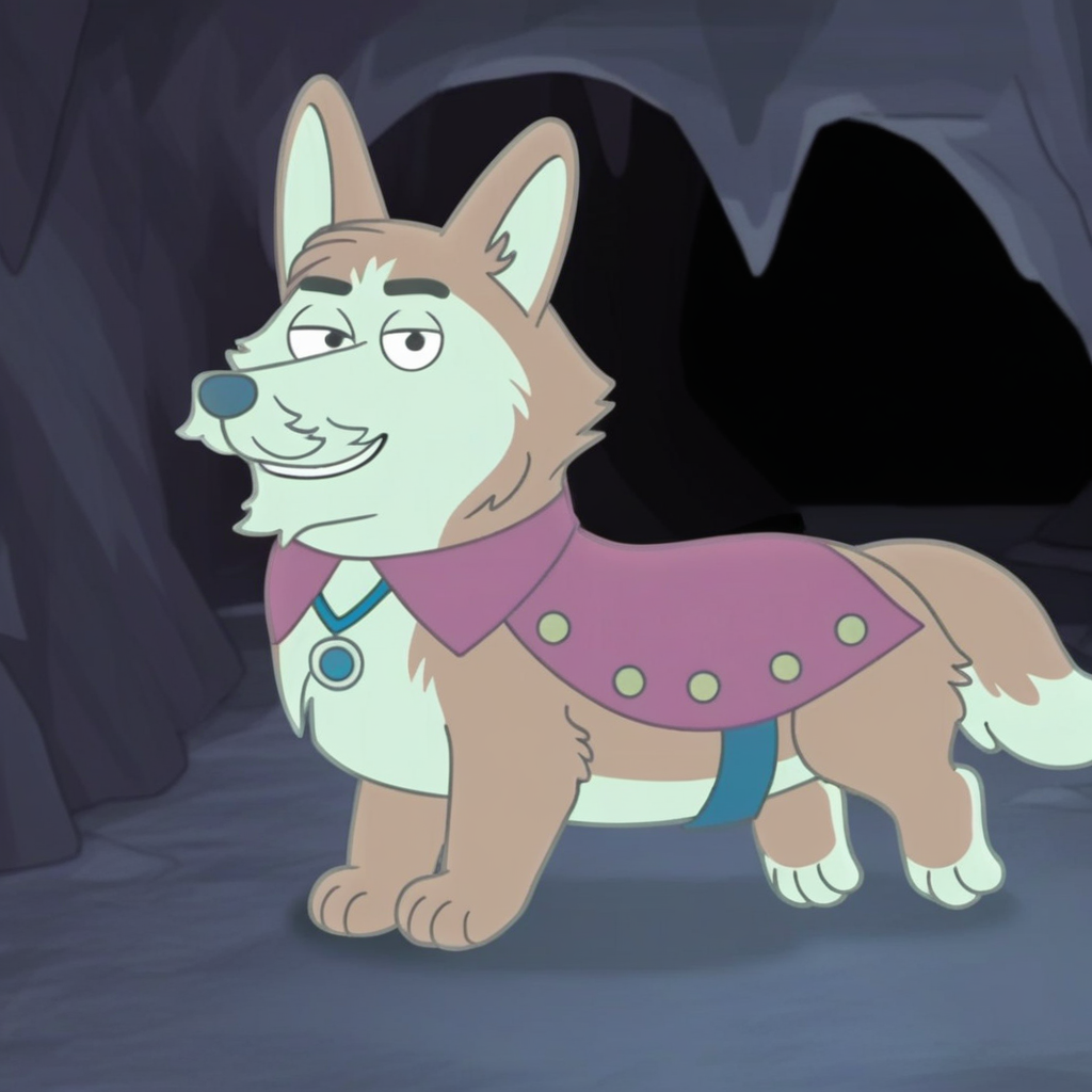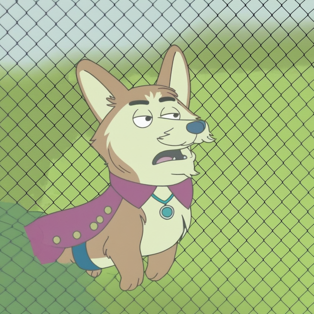 부유한 코기, 들개, 안면 털, 펜던트, 왕실 망토, 싱글, 검은 눈, 머리 위로 향함,