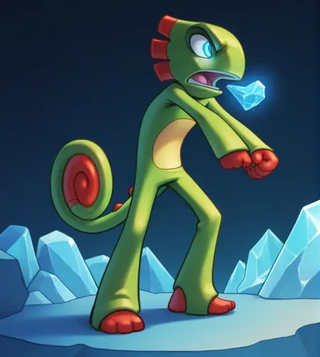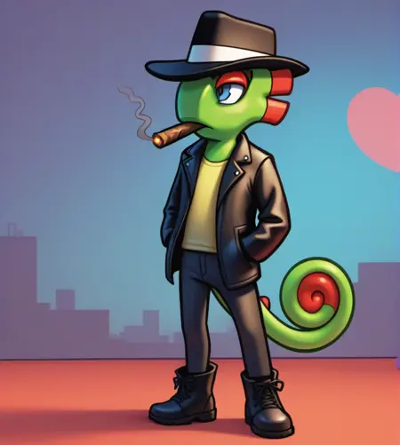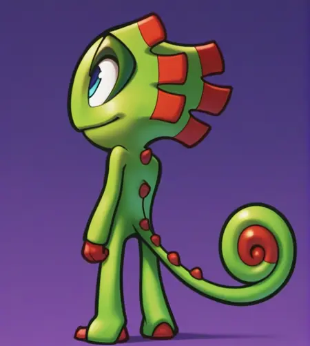 Yooka tags: "yooka, scalie, chameleon, ear frill, curled tail (or long tail if his tail is uncurled), back spikes, blue eyes, orange eyeshadow, green skin, multicolored body" (putting "back spikes" tends to cause Yooka to face away despite putting "front view" in the prompt)