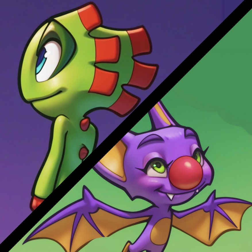 Based on Yooka & Laylee's looks from the Yooka-Laylee and the Kracklestone comic, I tried generating them both in the same image without inpainting but haven't figured it out