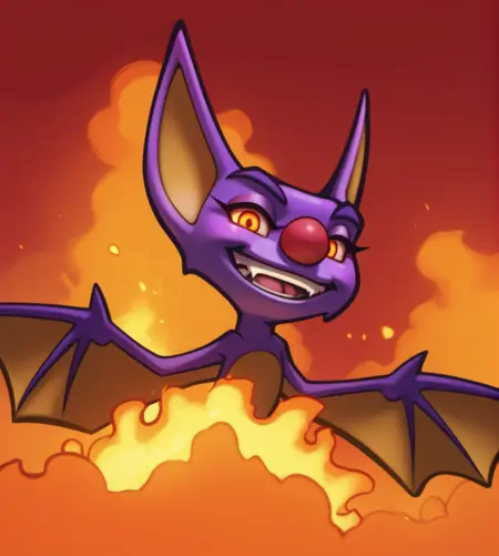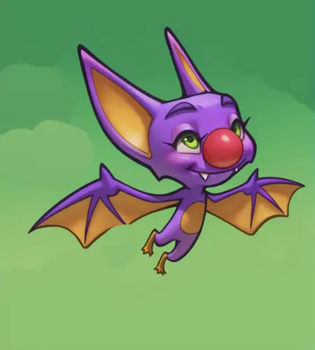 Laylee tags: "laylee, bat, feral, membranous wings, winged arms, big ears, big nose, red nose, purple skin, yellow feet, fangs, green eyes"