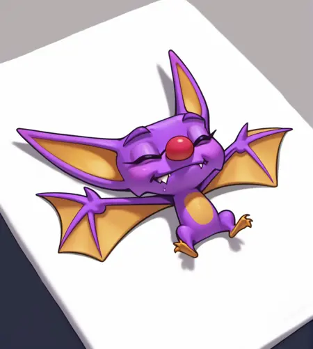 Laylee 标签:“laylee, 蝙蝠, 野性, 膜状翅膀, 带翼手臂, 大耳朵, 大鼻子, 红鼻子, 紫色皮肤, 黄色脚掌, 尖牙, 绿眼睛”
