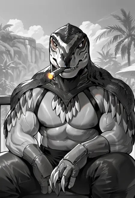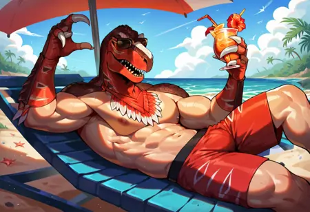 muscular, dinosaur, sharp teeth, red scales, tan skin, tail, claws,