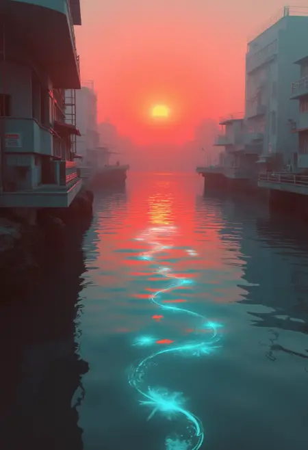 建物や抽象的な幾何学的形状が現れ、超現実的な雰囲気を強調し、LoRAの独自の色の装飾を際立たせます。