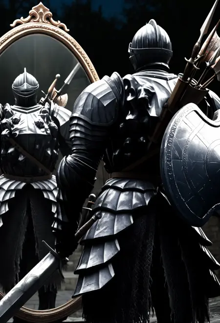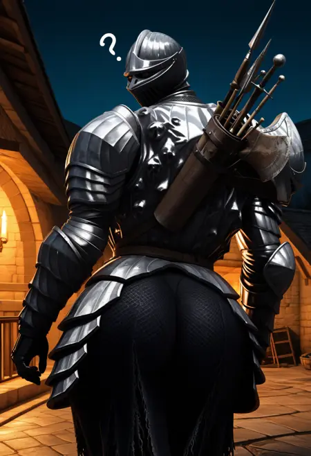 Looks tags: armor, plate armor, helmet, pauldrons, breastplate, gauntlets, belt, quiver, weapon on back, faulds, chainmail, greaves