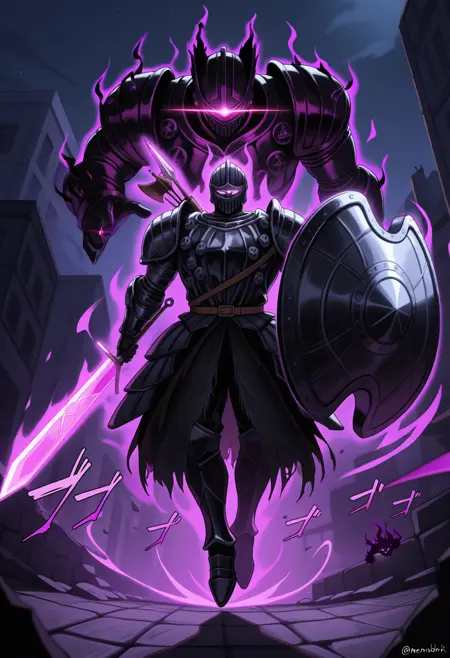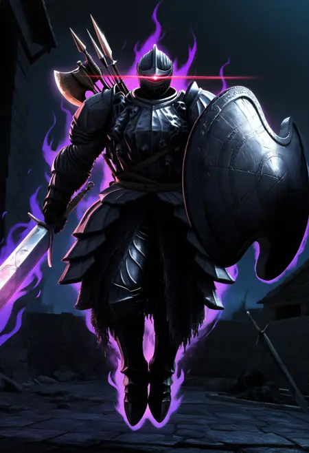 Optional tags: holding shield, holding greatsword, glowing eye, glowing weapon, floating