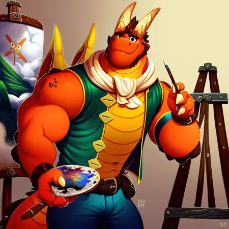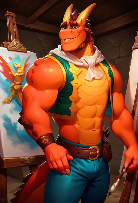 Delbin, anthro, dragon, mature male, horns, red orange skin, light underbelly, brown hair, brown eyes, athletic build, muscular male, buff, sideburns, facial hair, thick eyebrows