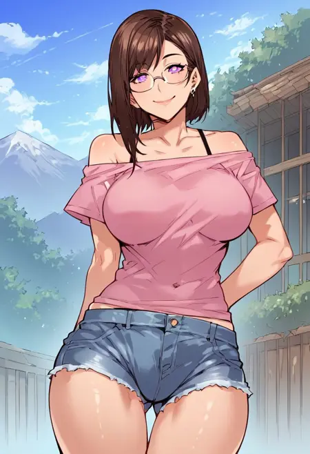 3. ((어깨 드러난 짧은 소매 상의, 청바지 반바지, 안경, 검은 끈, ))
