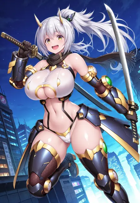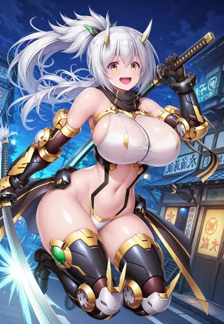 태그: 키리하라 주ン코, 긴 머리, 흰 머리, 꼬리머리, 노란 눈, 거대한 가슴, 반짝이는 피부, 곡선미, 넓은 엉덩이, 눈 사이의 머리카락, 기계식 옴니 뿔, V자 앞머리,