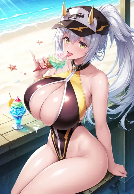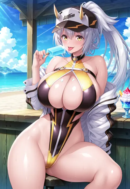 Tags: Junko Kirihara, long hair, white hair, ponytail, yellow eyes, huge breasts, shiny skin, curvy, wide hips, hair between eyes, mechanical oni horns, v bangs,