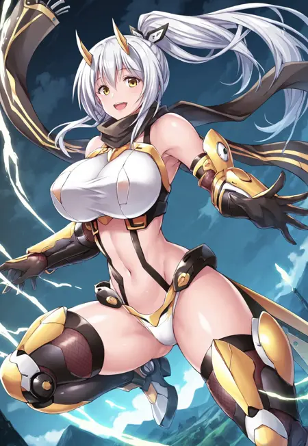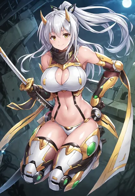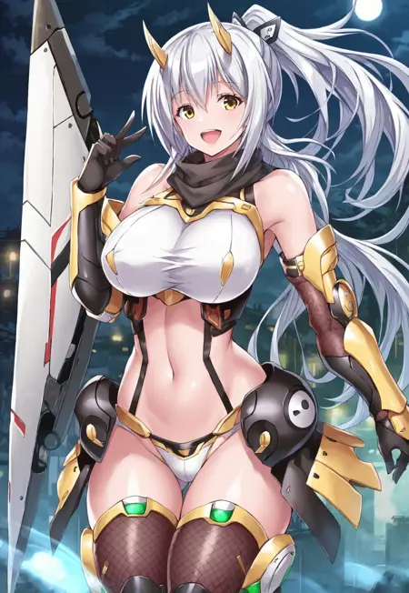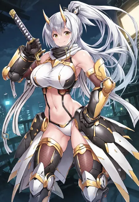タグ:桐原 Junko、長い髪、白髪、ポニーテール、黄色い目、巨乳、ツヤのある肌、くびれ、広い hips、眉間の髪、機械式鬼角、V字前髪、