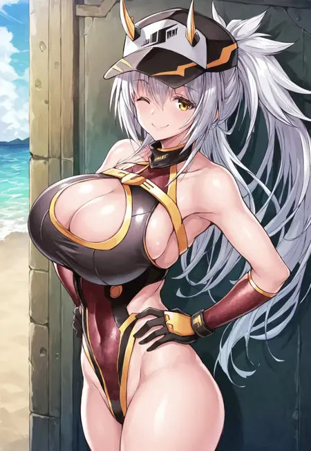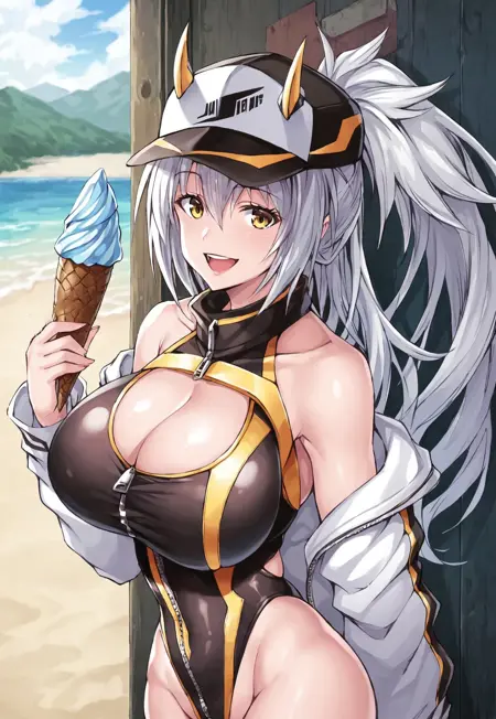 2つ目の衣装:ベースボールキャップ、アンダーブレスト、胸元のカットアウト、服のカットアウト、ハイレグワンピース水着