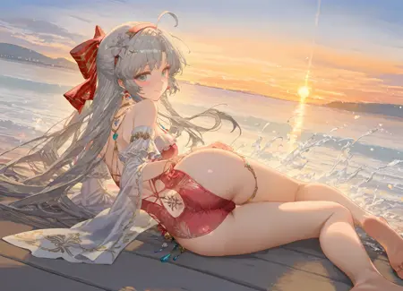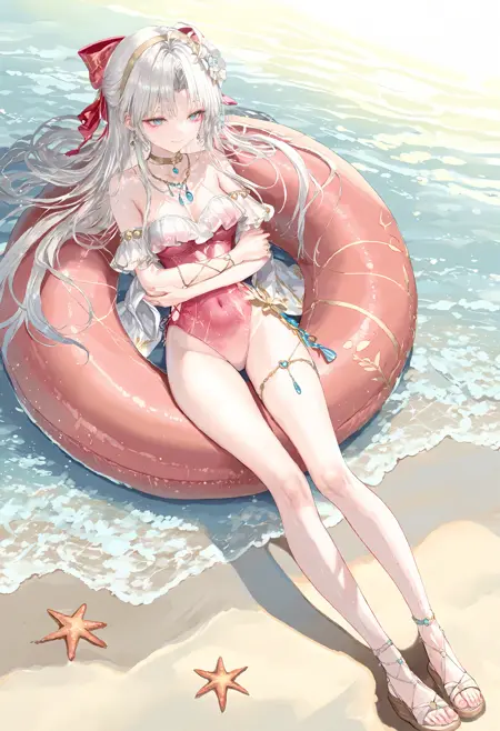 カロッタ ビキニスキン(Splashing Summer): carlotta \(splashing summer\), pink hair bow, bell earrings, necklace, detached sleeves, criss-cross arm strap, thighlet, sandals