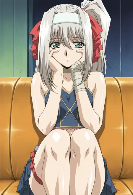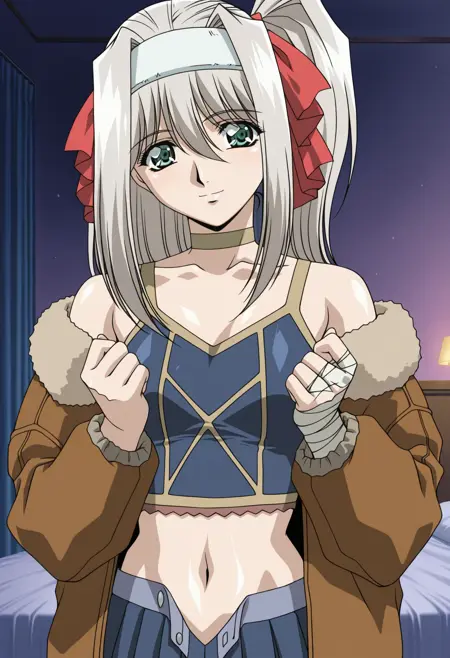 베이스: honoka_d, 1girl, 애니메이션 색감, 싱글, 긴 머리, 토끼꼬리, 흰 머리, 흰 헤어밴드, 눈 사이의 머리카락, 빨간 머리 리본, 녹색 눈, 총알 목걸이, 갈색 털장식 재킷, 크롭탑, 복부, 배꼽, 푸른 색 단추 풀린 주름 치마, 한쪽 허벅지 리본, 한쪽 손 붕대 감음, 벌어진 재킷, 미니 치마, 작은 가슴,