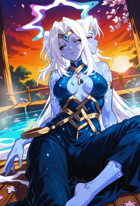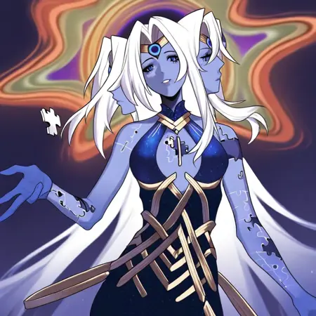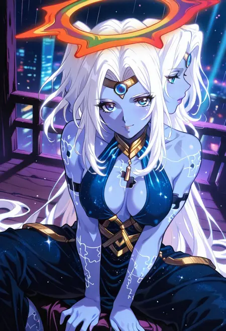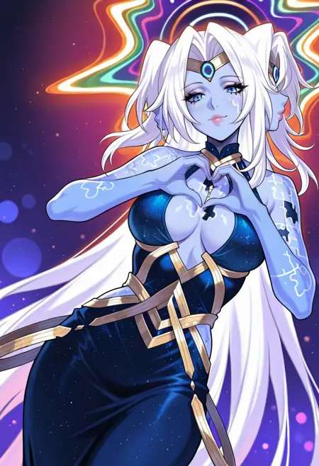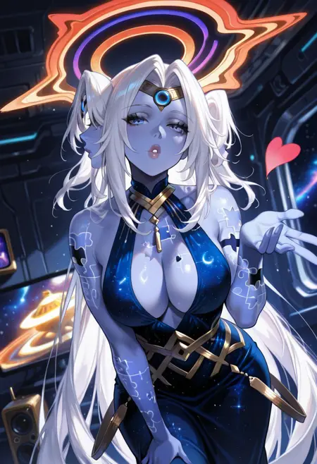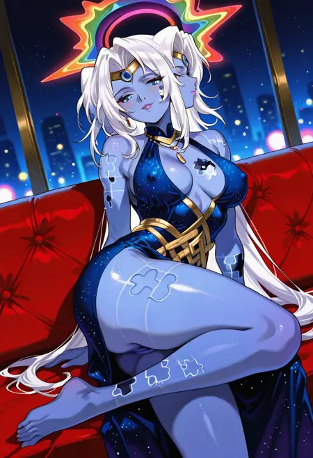 XipeHSR, 1girl, solo, female humanoid, monster girl, alien, three faces, long hair, white hair, curtain bangs, circlet, blue eyes, lips, colored skin, halo, light blue skin, periwinkle skin, puzzle pieces skin, large breast, cleavage, blue dress, long dress, necklace, dress ornament, barefoot, lattice of gold decorations, forehead jewel, cosmic print dress, bare shoulders, wide hips, bodycon dress,