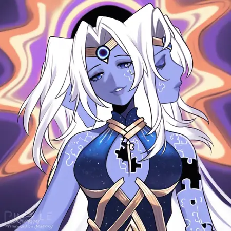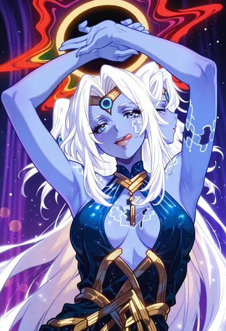 XipeHSR,1个女孩,单独,女性人形,怪物女孩,外星人,三张脸,长发,白发,帘式刘海,头环,蓝眼睛,嘴唇,有色皮肤,光环,淡蓝色皮肤,淡紫色皮肤,拼图块状皮肤,大乳房,乳沟,蓝色连衣裙,长裙,项链,裙装装饰,赤脚,金色装饰网格,额饰,宇宙印花连衣裙,露肩,宽臀,紧身连衣裙