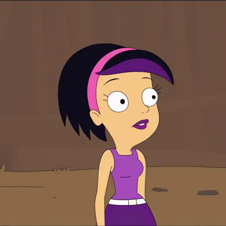 Trigger words: 1girl, Solo, RoxyW_CC, light skin, black hair with a purple streak, short hair, black eyes, pink headband, purple lips, violet sleeveless blouse, purple short skirt, white belt, pink sneakers, big eyes