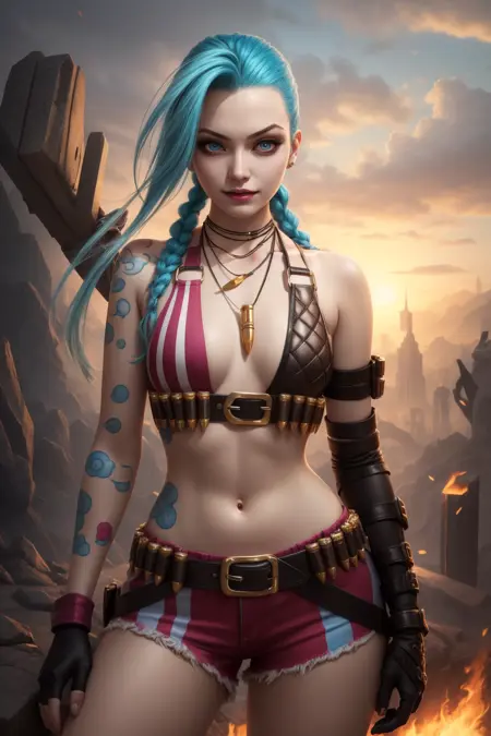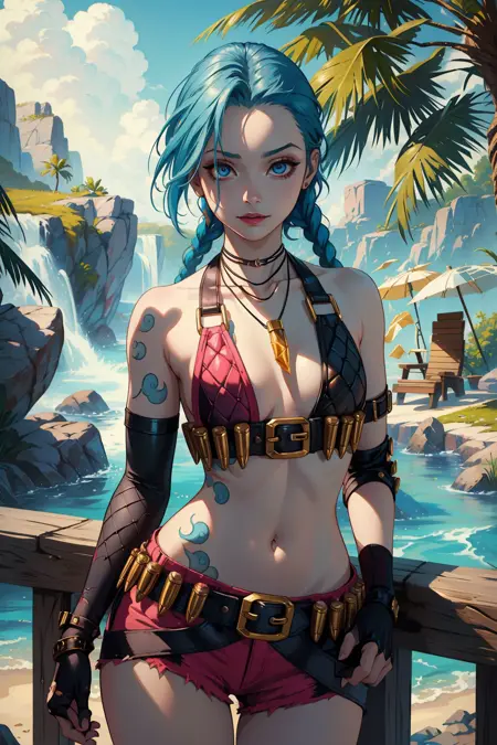 Base: jinx \(league of legends\), 1girl, twin braids, single elbow glove, short shorts, bikini top only, necklace, belt, bullet, fingerless gloves