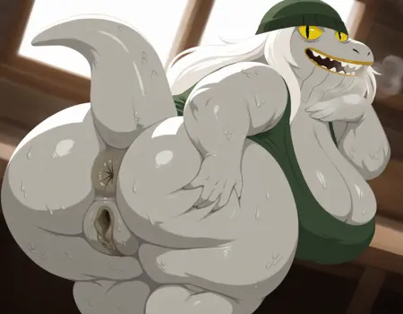 elderly,obese,female,crocodile,green dress,green beanie hat,black shoes,white hair,grey pale skin