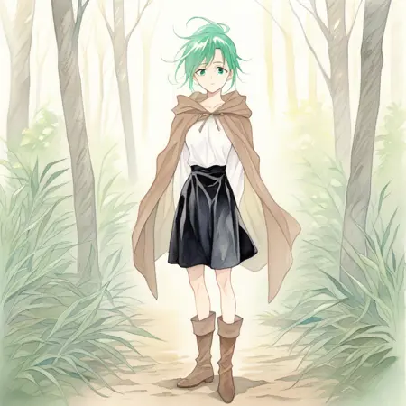 (갈색 후드 롱코트, 후드 아래로), 흰색 셔츠, 검은 치마, 부츠