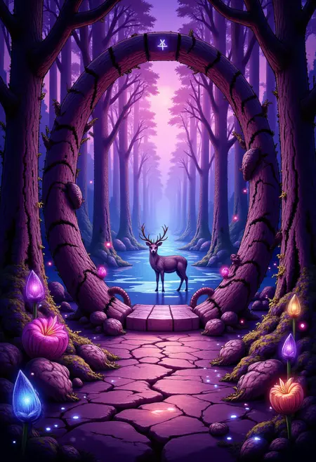 "황혼에 빛나는 꽃과 생물 발광 버섯으로 조명된 마법의 숲 풍경을 생성하세요. 빛나는 이끼로 덮인 거대한 나무들이 맑은 유리 같은 시냇물 위에 우뚝 서 있고, 문자가 새겨진 사슴들이 평화롭게 물을 마십니다. 분위기는 정교한 리얼리즘과 경쾌한 매력을 결합하여 고요하고 마법 같은 느낌을 전달해야 합니다."