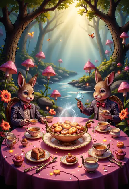 - 장난스러운 장식: 과도하게 큰 꽃, 빛나는 생물, 반짝이는 디테일이 동화책의 매력을 떠올리게 합니다.