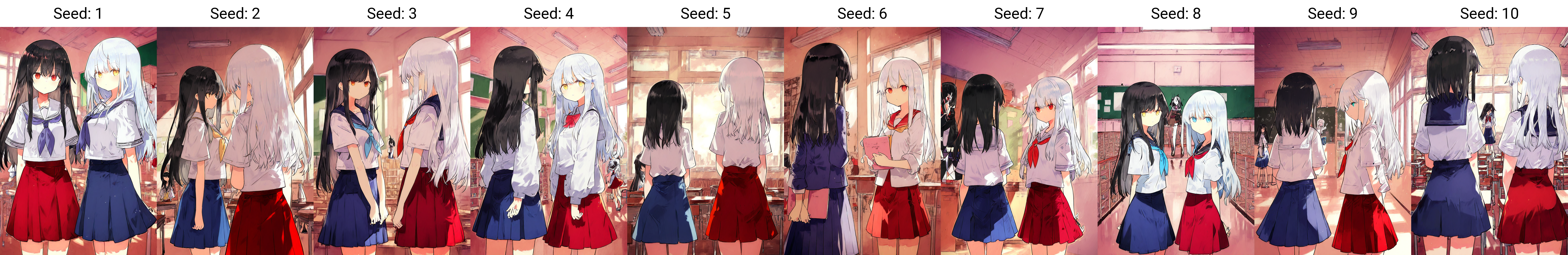 分离人物时需要给prompt加上希腊字母前缀,表示它属于哪个人,例如2girls, α black hair, α blue skirt, β white hair, β red skirt, indoors。