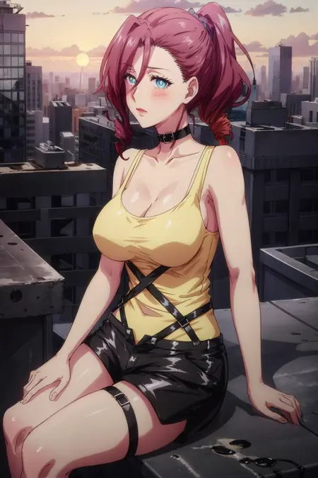 기본 옷차림: 초커, 탱크 탑, 하네스, 반바지, 허벅지 스트랩, 부츠,