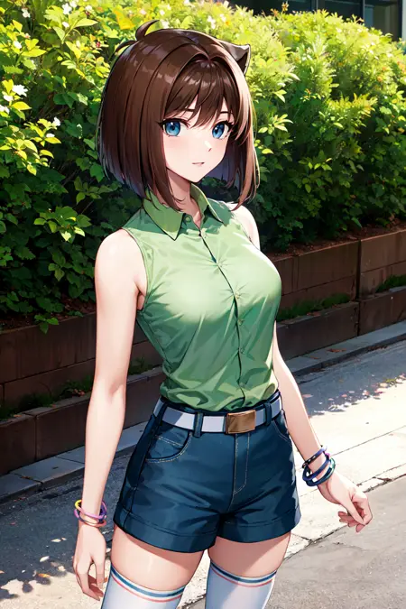 아우트핏3aamazaki, (antenna hair:1.2), 중간 크기 가슴, 녹색 셔츠, 소매 없음, 팔찌, 벨트, 파란색 반바지, 흰색 허벅지 스타킹