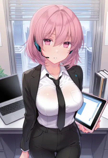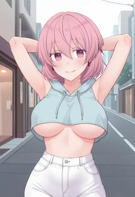 권장 프롬프트: momozono, 분홍색 머리, 짧은 머리, 분홍색 눈, 앞머리, 헤어클립, 긴 속눈썹, 눈 사이의 머리카락, 큰 가슴